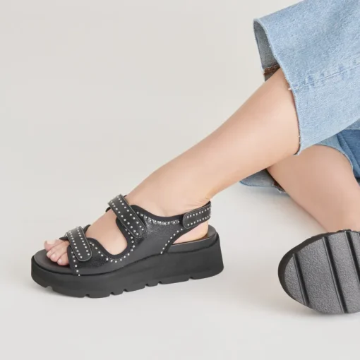 Utilitarian inspired with an emphasis on edge. DUBAI is comfort forward with a chunky platform sole, contoured footbed, and velcro straps. Choose from midnight crinkle patent or statement silver. Leather Upper EVA Outsole Water-based Leather Alternative Lining + Sock 2″ Platform Height Imported