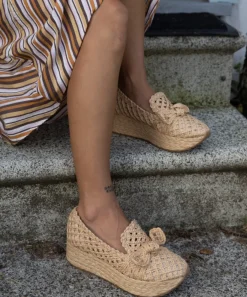 A beachy take on the sneaker, loafer crossover. JAKA is raffia all over with a platform sole and knotted bow detail. This unique silhouette is made for wide leg, flowy trousers or tailored shorts. Woven Raffia Upper Recycled Synthetic Sock Synthetic Lining Water-based Leather Alternative Sock 2″ Platform Height Imported